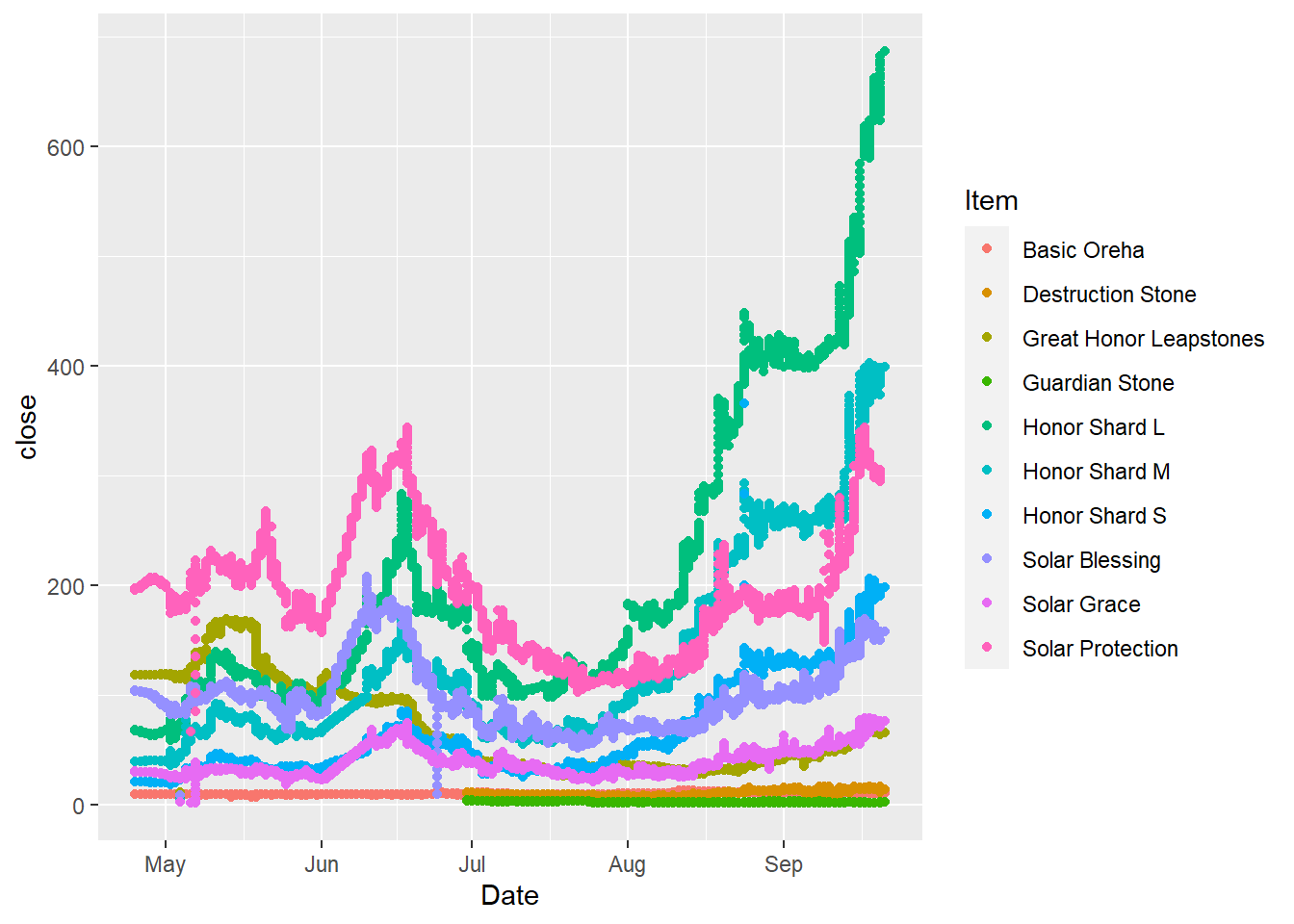 #Separating the items into similar groups to read the graph easier.#LAGHLD is a data set for Great Honor LeapstonesLAGHLD <- LostArkData %>%filter(LostArkData$Item %in%c("Great Honor Leapstones"))#LAOrehaD is a data set for Oreha material.LAOrehaD <- LostArkData %>%filter(LostArkData$Item %in%c("Basic Oreha"))#LADGD T3 Destruction, T3 GuardiansLADGD <- LostArkData %>%filter(LostArkData$Item %in%c("Destruction Stone","Guardian Stone"))#LARateupD is a data set for rate up materials LARateupD <- LostArkData %>%filter(LostArkData$Item %in%c("Solar Blessing","Solar Grace","Solar Protection"))#LAShardsD is a data set for the shard packsLAShardsD <- LostArkData %>%filter(LostArkData$Item %in%c("Honor Shard L","Honor Shard M","Honor Shard S"))