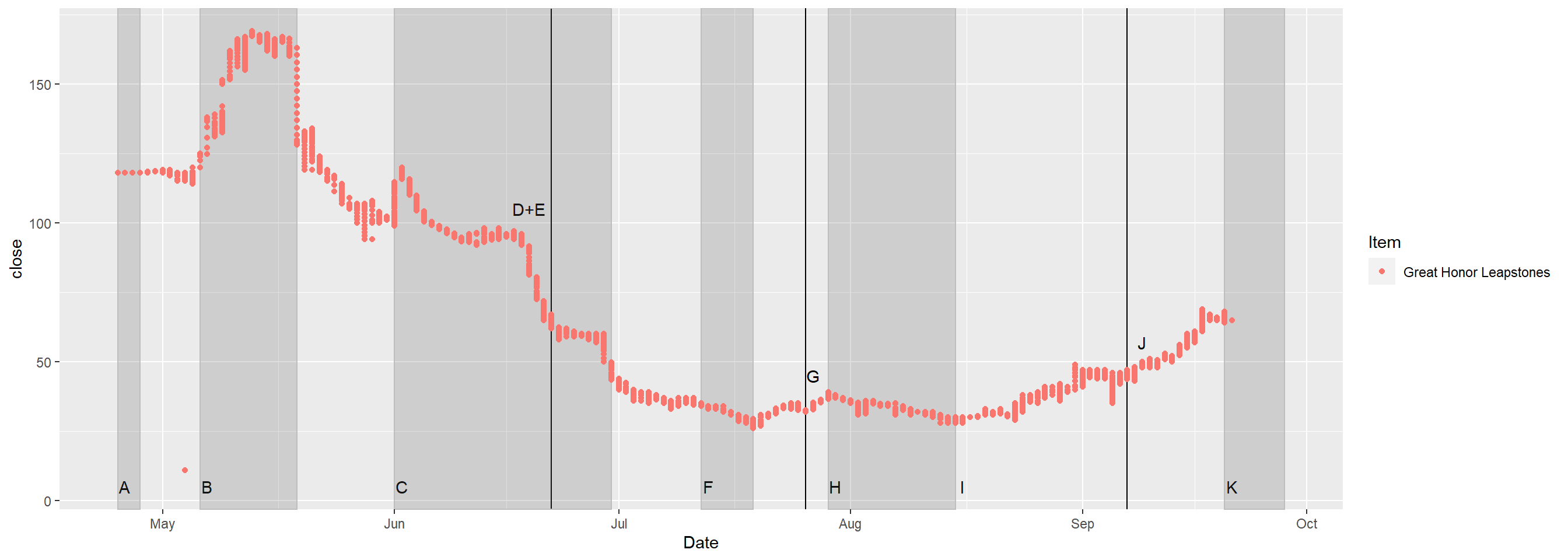 With these graphs peaks and valleys it would be important to look at dates that could cause these spikes and drops. One example could be sometime in july the prices of Great Honor Leapstones drops and continues to drop. These are dates after the dataset was created to help try and understand what could attribute to the behavior of these prices. The explanations of these events and how they could have affected prices will be explained on the final graph.