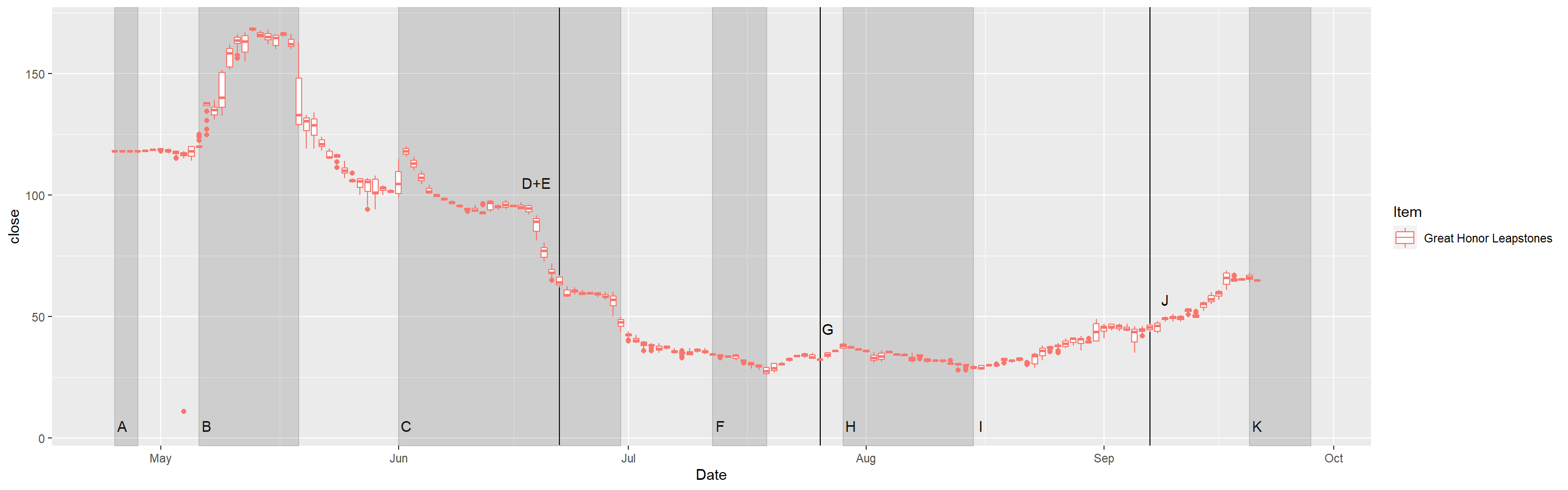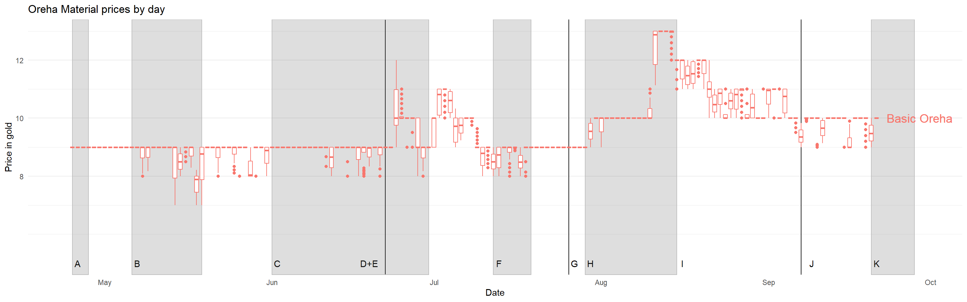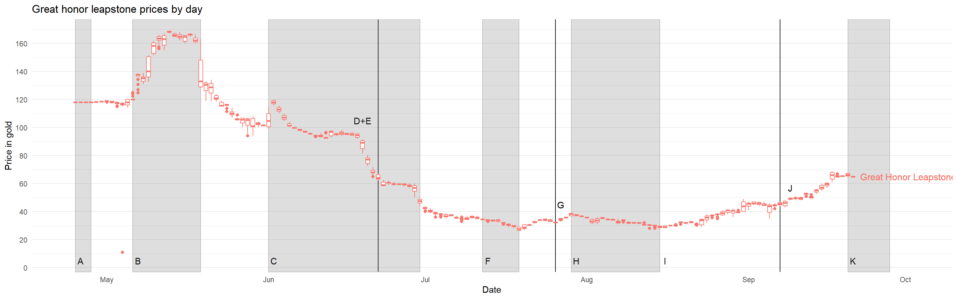 LAGHLGBPF <- LAGHLGBPF +scale_x_date() +scale_y_continuous(breaks =seq(0,180,by =20)) +ylab("Price in gold") +theme_minimal() +theme(legend.position ="none", panel.grid.minor.x =element_blank(), panel.grid.major.x =element_blank()) +labs(title ="Great honor leapstone prices by day")LADGGBPF <- LADGGBPF +theme_minimal() +scale_y_continuous(breaks =seq(0,20,by =2)) +ylab("Price in gold") +theme_minimal() +theme(legend.position ="none", panel.grid.minor.x =element_blank(), panel.grid.major.x =element_blank()) +labs(title ="Destruction and Guardian stone prices by day")LAOrehaDBPF <- LAOrehaDBPF +theme_minimal() +scale_y_continuous(breaks =seq(8,16,by =2)) +ylab("Price in gold") +theme_minimal() +theme(legend.position ="none", panel.grid.minor.x =element_blank(), panel.grid.major.x =element_blank()) +labs(title ="Oreha Material prices by day")LARateupGBPF <- LARateupGBPF +theme_minimal() +scale_y_continuous(breaks =seq(0,400,by =20)) +ylab("Price in gold") +theme_minimal() +theme(legend.position ="none", panel.grid.minor.x =element_blank(), panel.grid.major.x =element_blank()) +labs(title ="Rate up material prices by day")LAShardsGBPF <- LAShardsGBPF +theme_minimal() +scale_y_continuous(breaks =seq(0,750,by =50)) +ylab("Price in gold") +theme_minimal() +theme(legend.position ="none", panel.grid.minor.x =element_blank(), panel.grid.major.x =element_blank()) +labs(title ="Honor Shard pouch prices by day")LAGHLGBPF