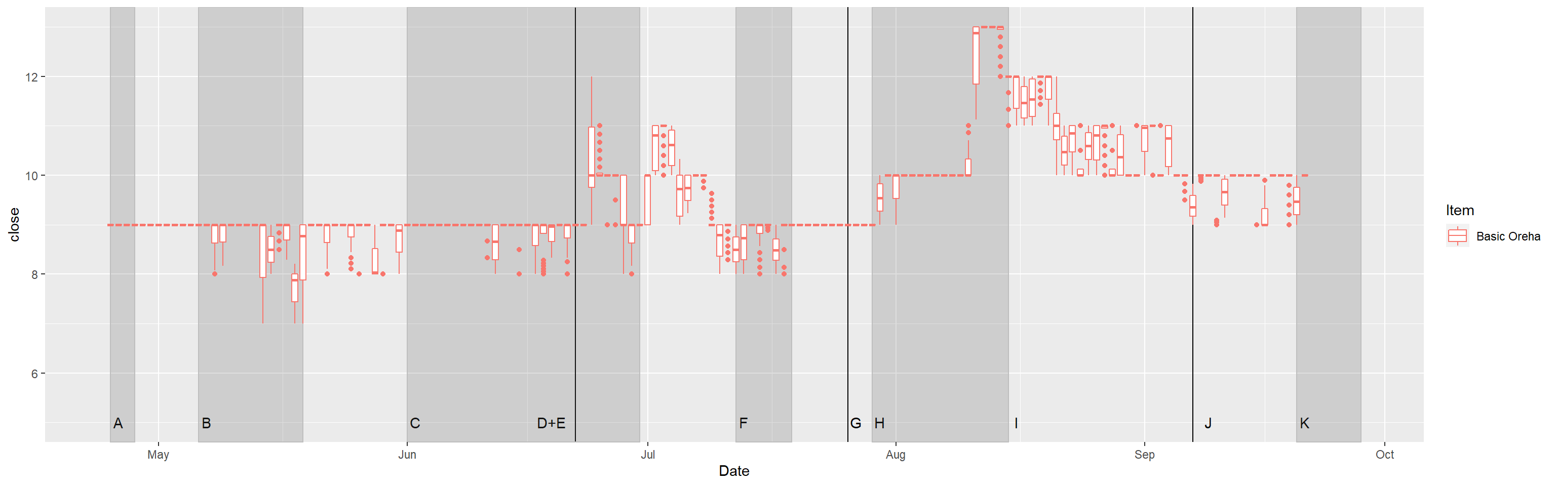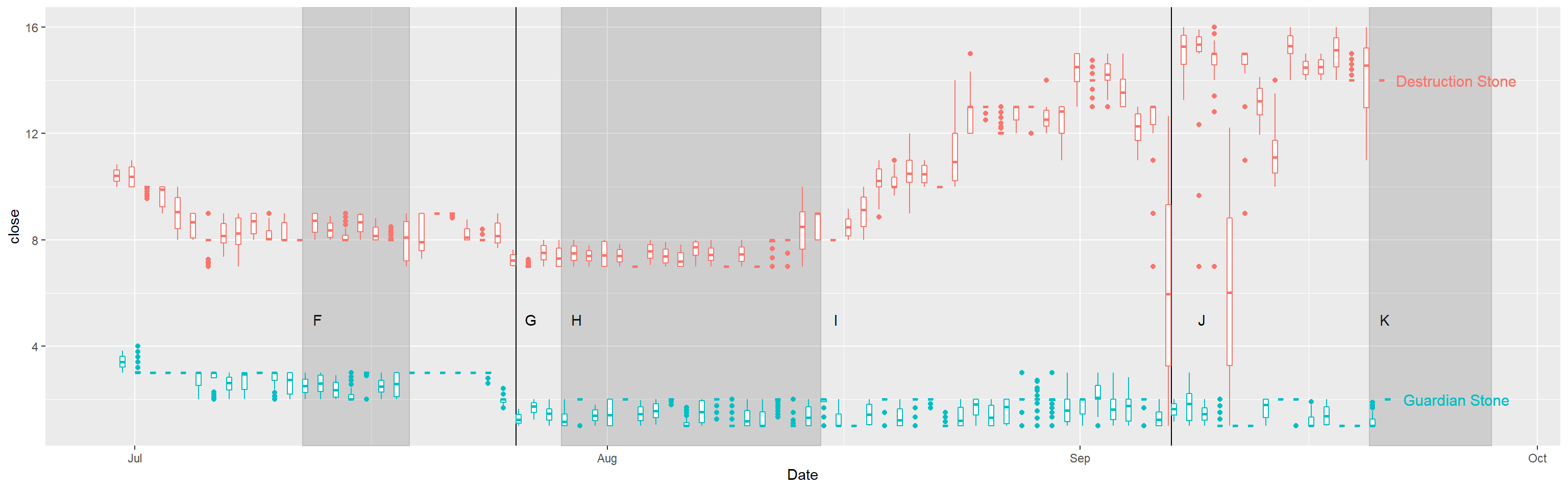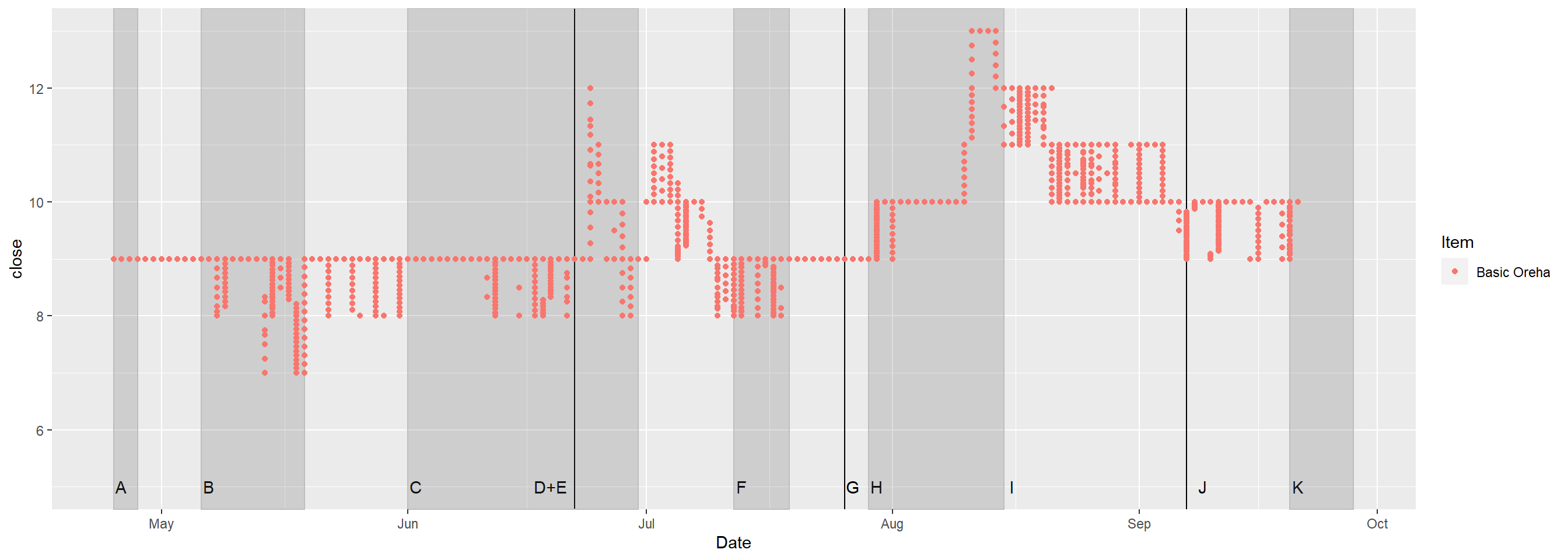 LAGHLGBPF <- LAGHLGBPF +scale_x_date() +scale_y_continuous(breaks =seq(0,180,by =20)) +ylab("Price in gold") +theme_minimal() +theme(legend.position ="none", panel.grid.minor.x =element_blank(), panel.grid.major.x =element_blank()) +labs(title ="Great honor leapstone prices by day")LADGGBPF <- LADGGBPF +theme_minimal() +scale_y_continuous(breaks =seq(0,20,by =2)) +ylab("Price in gold") +theme_minimal() +theme(legend.position ="none", panel.grid.minor.x =element_blank(), panel.grid.major.x =element_blank()) +labs(title ="Destruction and Guardian stone prices by day")LAOrehaDBPF <- LAOrehaDBPF +theme_minimal() +scale_y_continuous(breaks =seq(8,16,by =2)) +ylab("Price in gold") +theme_minimal() +theme(legend.position ="none", panel.grid.minor.x =element_blank(), panel.grid.major.x =element_blank()) +labs(title ="Oreha Material prices by day")LARateupGBPF <- LARateupGBPF +theme_minimal() +scale_y_continuous(breaks =seq(0,400,by =20)) +ylab("Price in gold") +theme_minimal() +theme(legend.position ="none", panel.grid.minor.x =element_blank(), panel.grid.major.x =element_blank()) +labs(title ="Rate up material prices by day")LAShardsGBPF <- LAShardsGBPF +theme_minimal() +scale_y_continuous(breaks =seq(0,750,by =50)) +ylab("Price in gold") +theme_minimal() +theme(legend.position ="none", panel.grid.minor.x =element_blank(), panel.grid.major.x =element_blank()) +labs(title ="Honor Shard pouch prices by day")LAGHLGBPF