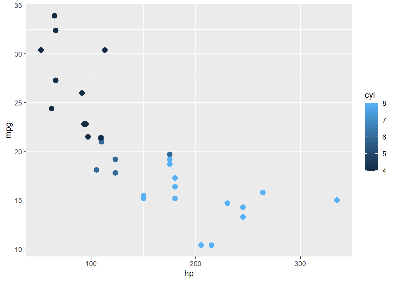 ggplot(mtcars, aes(x=hp, y=mpg, color=cyl)) +geom_point(size=3)