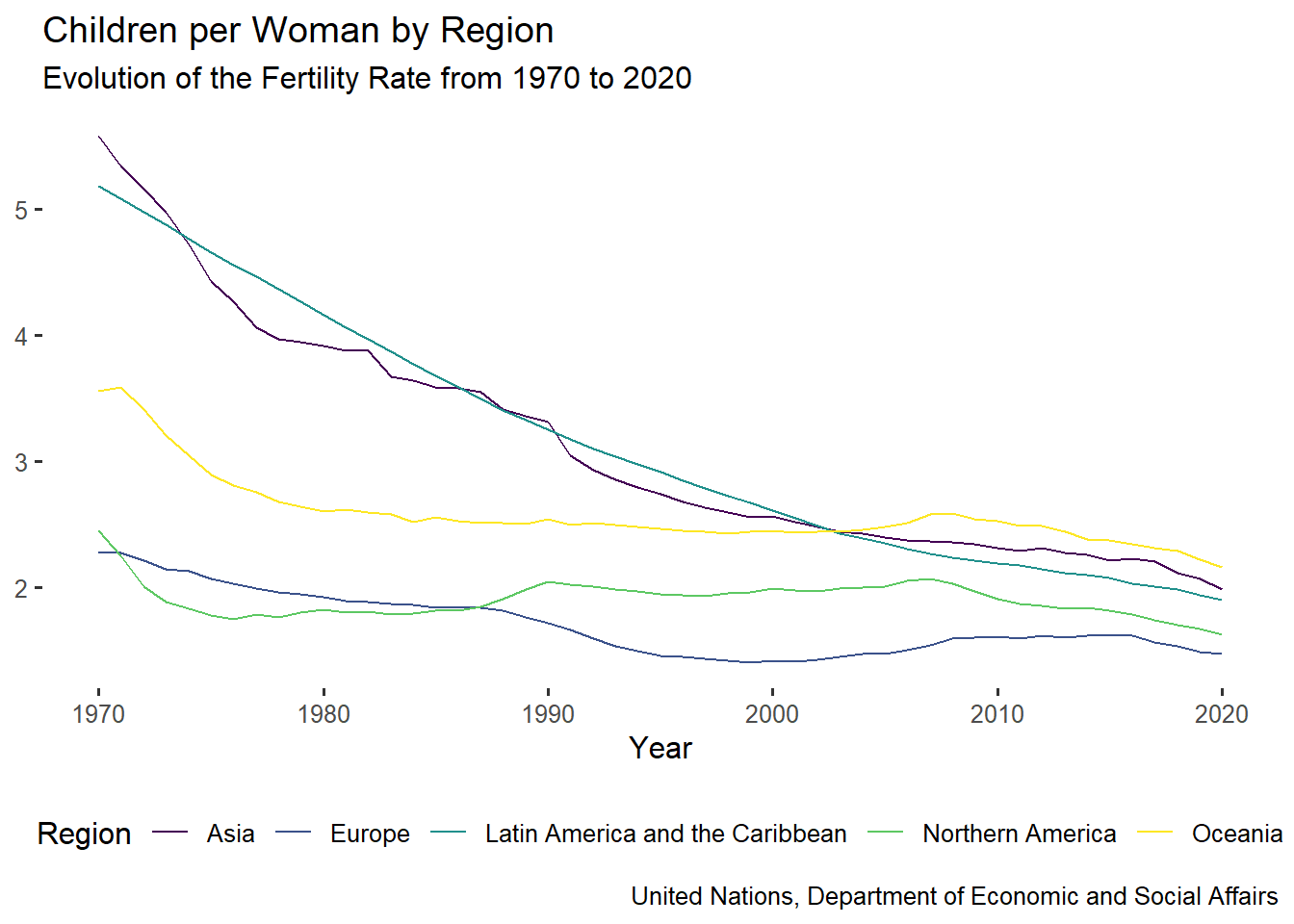 dem <-read_csv('dem.csv', show_col_types =FALSE)tfr <-select(dem, LocTypeName, Location, Time, TFR) %>%filter( LocTypeName=="Geographic region"& Location !="Africa"& Time <=2020& Time >=1970)gtfr <-ggplot(data = tfr, mapping =aes(x = Time, y = TFR, color=Location))gtfr <- gtfr +geom_line()gtfr <- gtfr +theme_tufte(base_size=12, base_family ="sans") +labs(title="Children per Woman by Region", subtitle="Evolution of the Fertility Rate from 1970 to 2020", caption="United Nations, Department of Economic and Social Affairs") +guides(color=guide_legend(title="Region"))gtfr <- gtfr +scale_color_viridis(discrete =TRUE)gtfr <- gtfr +ylab(NULL) +xlab("Year") +scale_x_continuous(breaks =seq(1970,2020,10)) +theme(legend.position ="bottom")gtfr