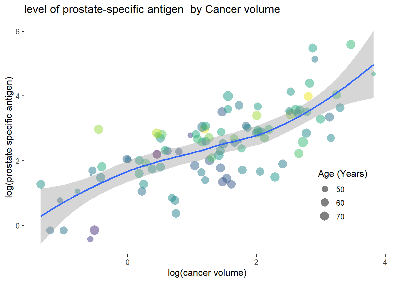 Pro = Pro + scale_color_viridis(discrete = FALSE) + ggtitle("level of prostate-specific antigen by Cancer volume")ggplot Assignment