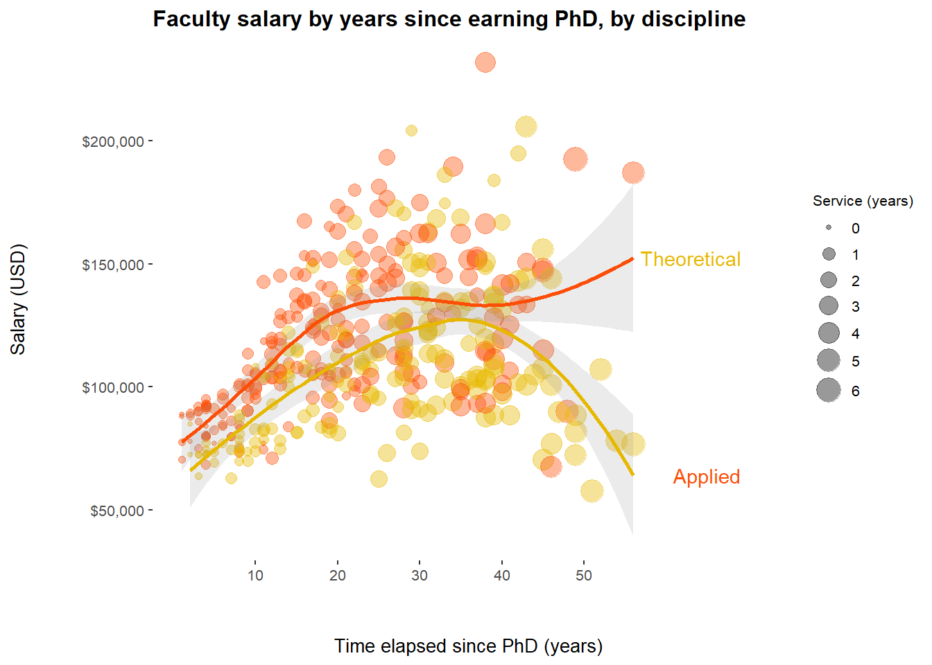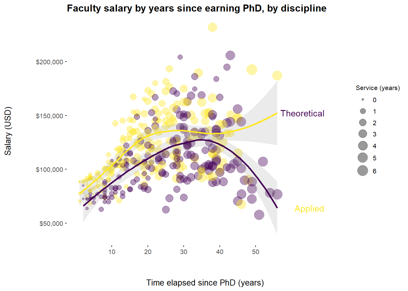 For the first plot, I plotted salary against years elapsed since earning PhD degree. The data points are further color coded by whether the faculty member is in a theoretical or applied field, and the size reflects years of service.