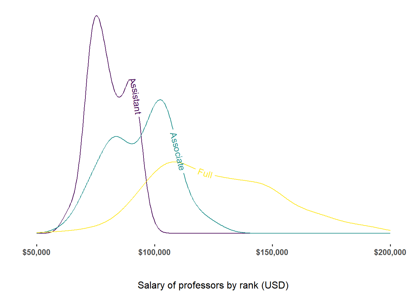 This second plot is a salary density plot for three different professorial ranks. On average, full professors make more than associate professors, and associate professors more than assistant professors. The salaries of assistant professors are more tightly distribution around the median for the group, than those of associate professors, and full professors, progressively.